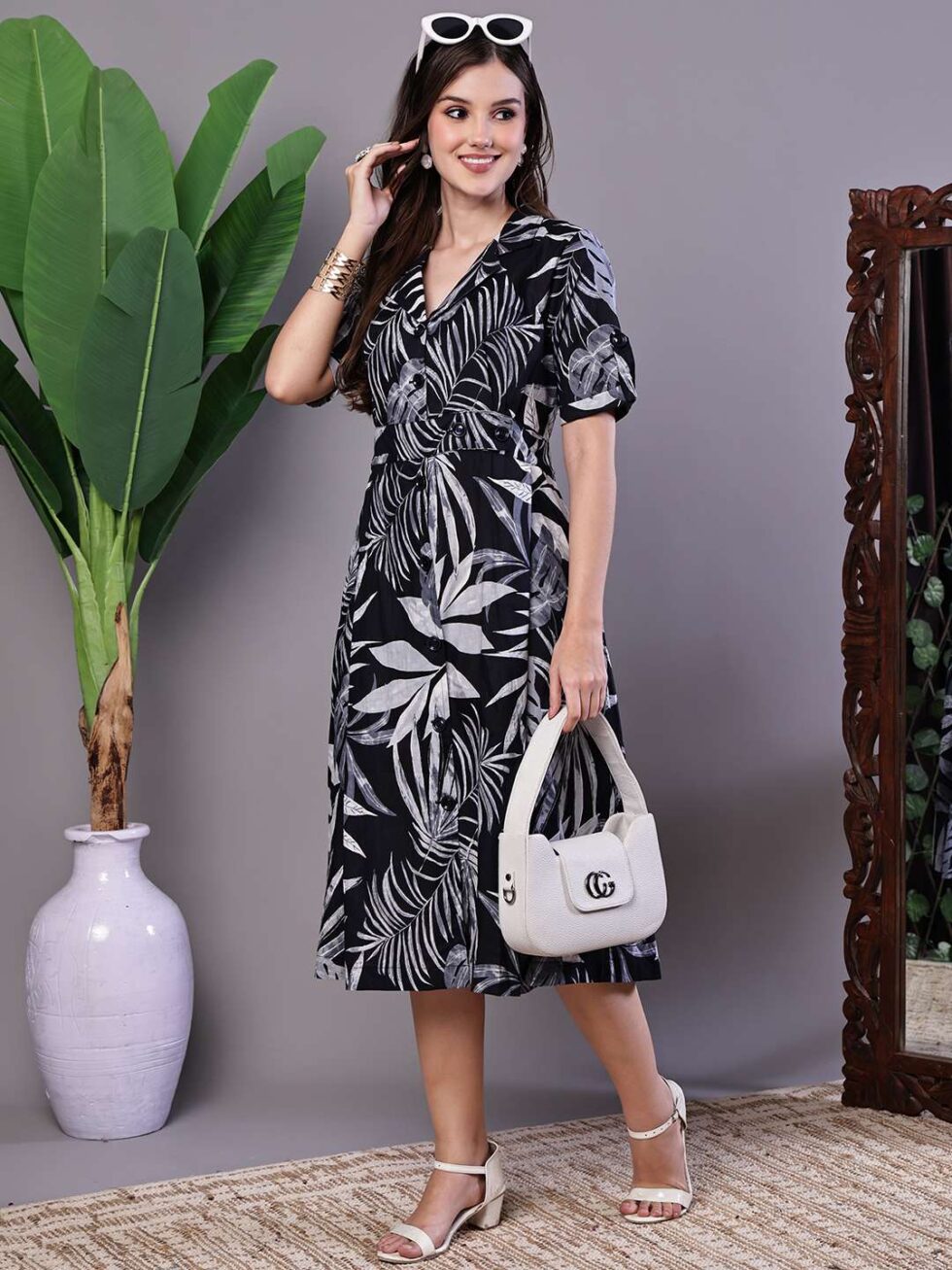 Women’s Tropical Palm Print Black & White Cotton Shirt Dress